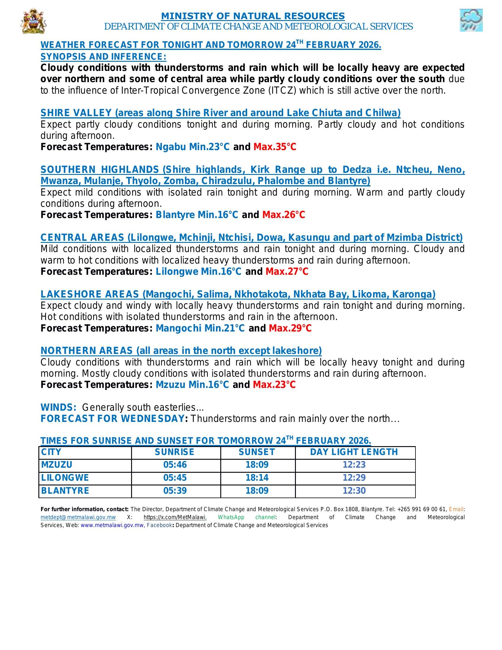 Malawi’s Department of Climate Change and Meteorological Services (DCCMS) says cloudy conditions with thunderstorms and rain, which will be locally heavy, are expected over northern Malawi and some central areas, while the south is forecast to be partly cloudy, according to DCCMS’s weather forecast for tonight and tomorrow, February 24, 2026. DCCMS attributes the pattern to the Inter Tropical Convergence Zone (ITCZ) being active over the north.