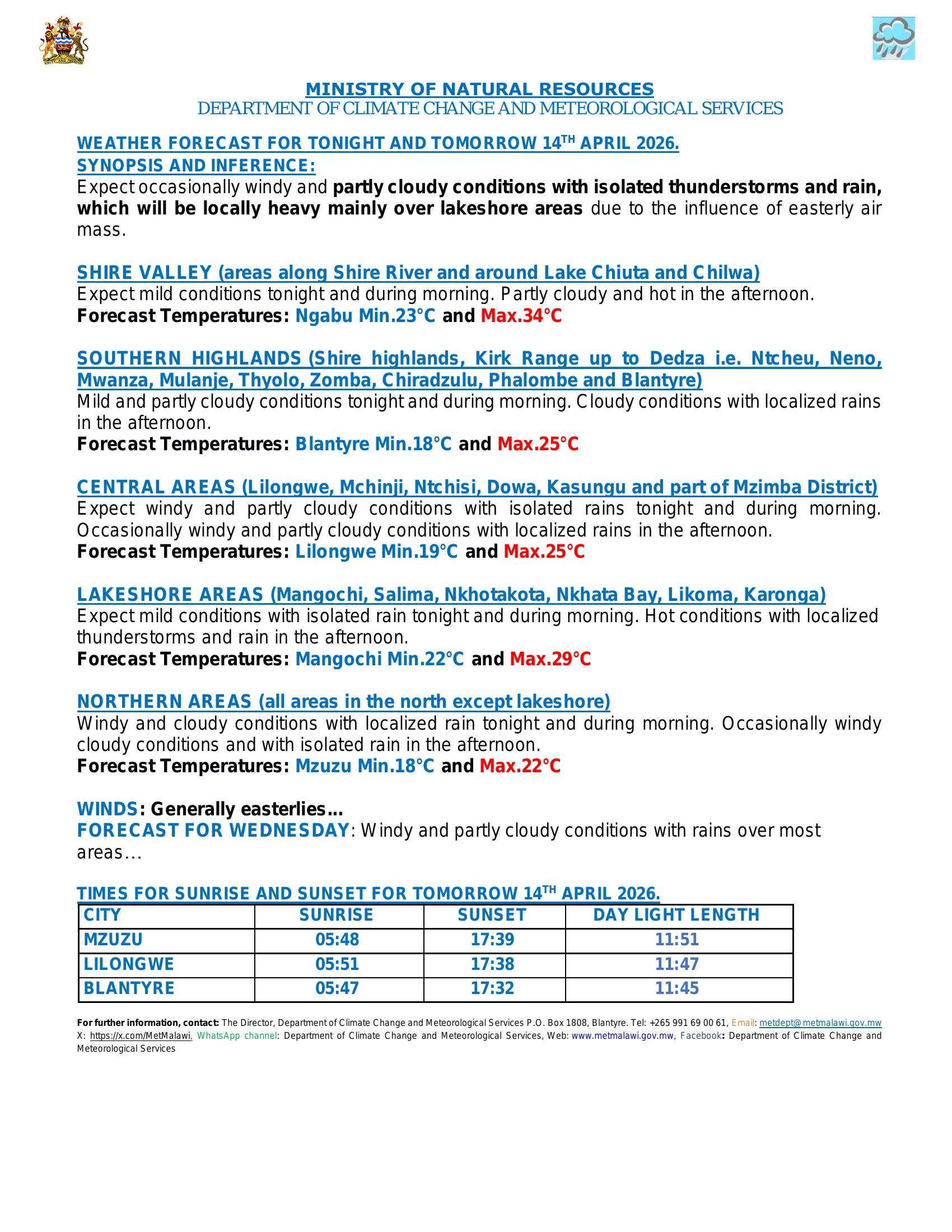 The Department of Climate Change and Meteorological Services has forecast locally heavy rains and isolated thunderstorms over Malawi's lakeshore areas, according to an update released on April 13. The weather bulletin indicates that the region will experience occasionally windy and partly cloudy conditions driven by an easterly air mass, metmalawi.gov.mw reports.