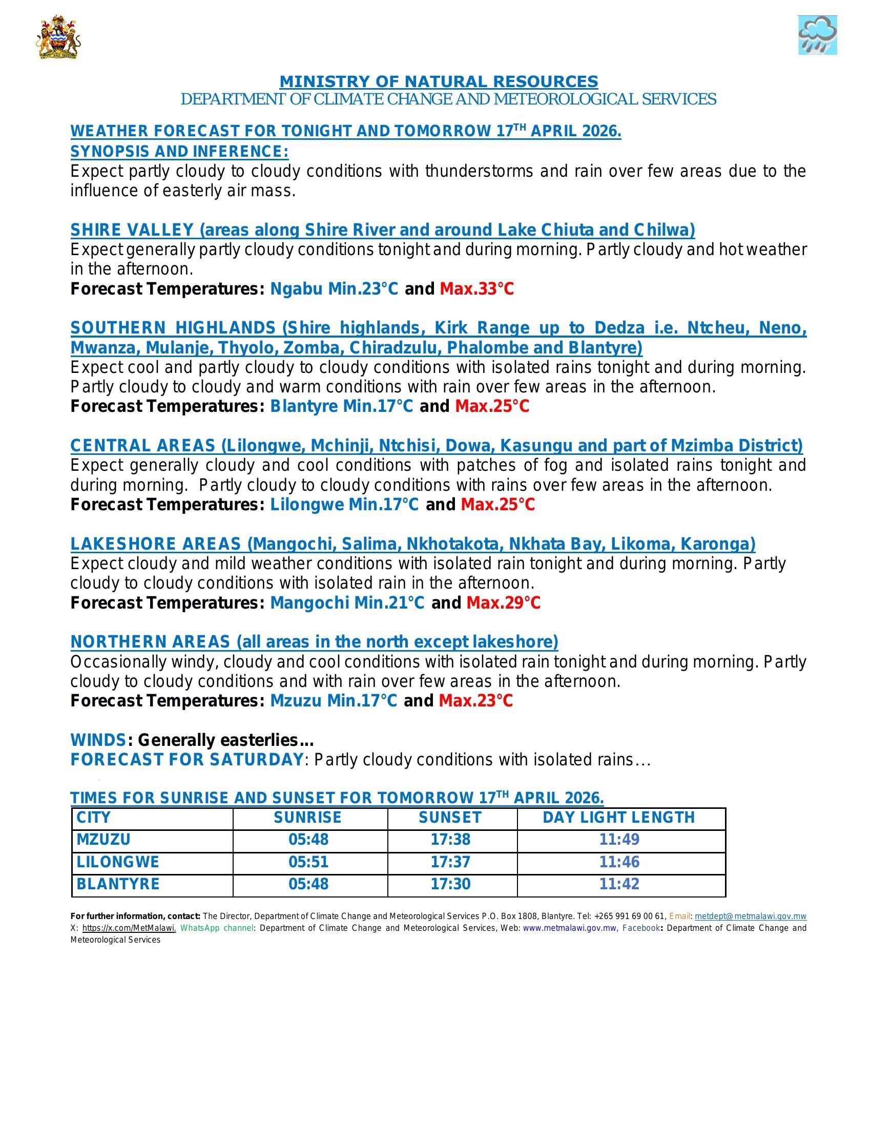 The Department of Climate Change and Meteorological Services has issued updated weather forecasts for Malawi, predicting partly cloudy to cloudy conditions accompanied by isolated thunderstorms and rain. According to the department, these current weather patterns are driven by the influence of an easterly air mass moving across the region.